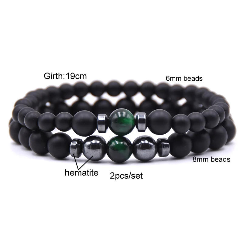 The pack of two bracelets consists of the first one with 8mm beads and the second one with 6mm beads. Each bracelet has a common colored bead that represents the link you can share. Both bracelets have separators or natural beads of hematite.